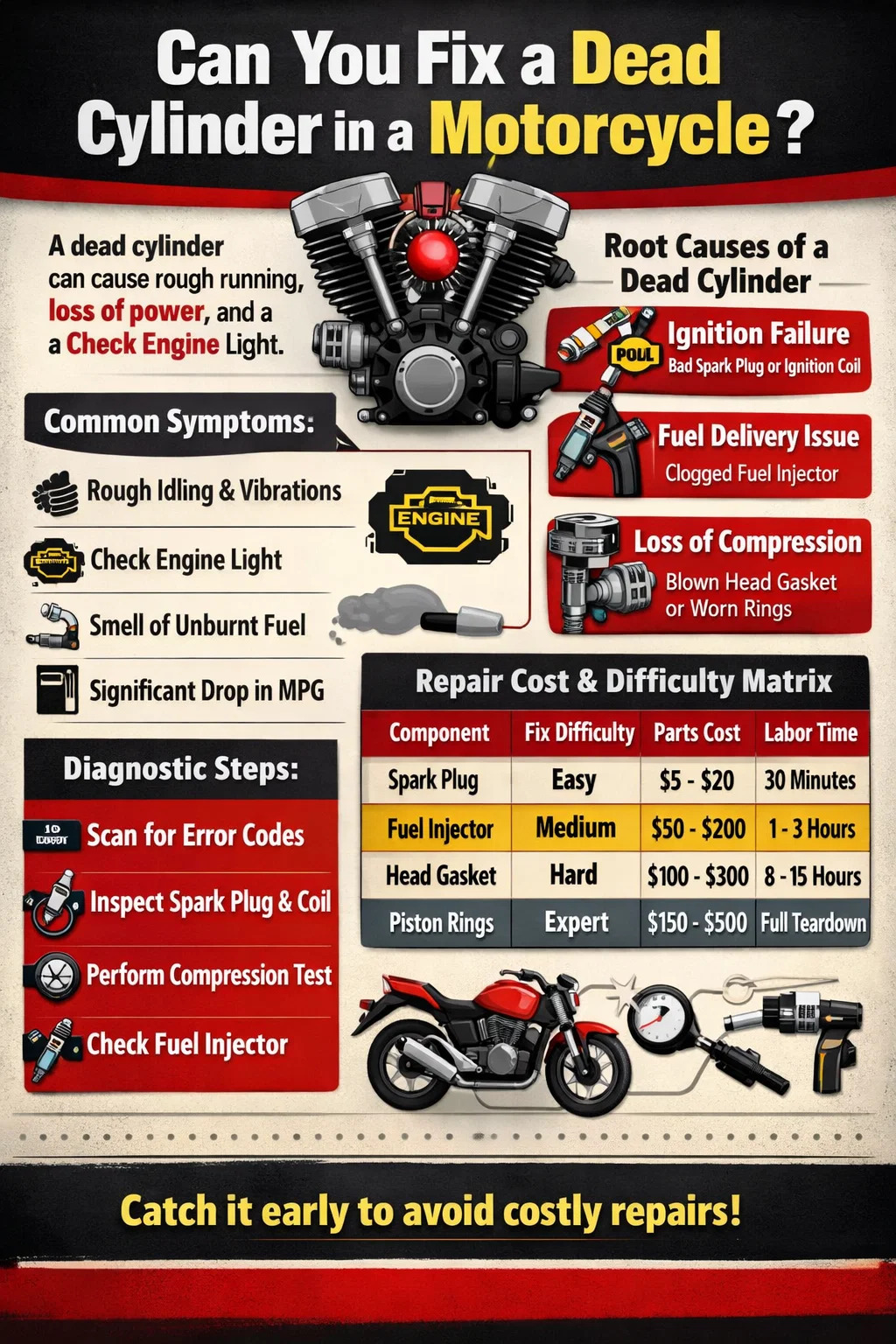 Ha a gyújtógyertya elszennyeződött vagy a gyújtótekercs meghibásodott, a keverék az adott motorkerékpár henger nem fog kigyulladni. A gyújtógyertya cseréje a leggyakoribb megoldás. Ha a tekercs halott, egy működő hengerből származó tekercsre cserélve nagyszerű módja annak tesztelésére, hogy a "halál" az új helyre költözik-e.