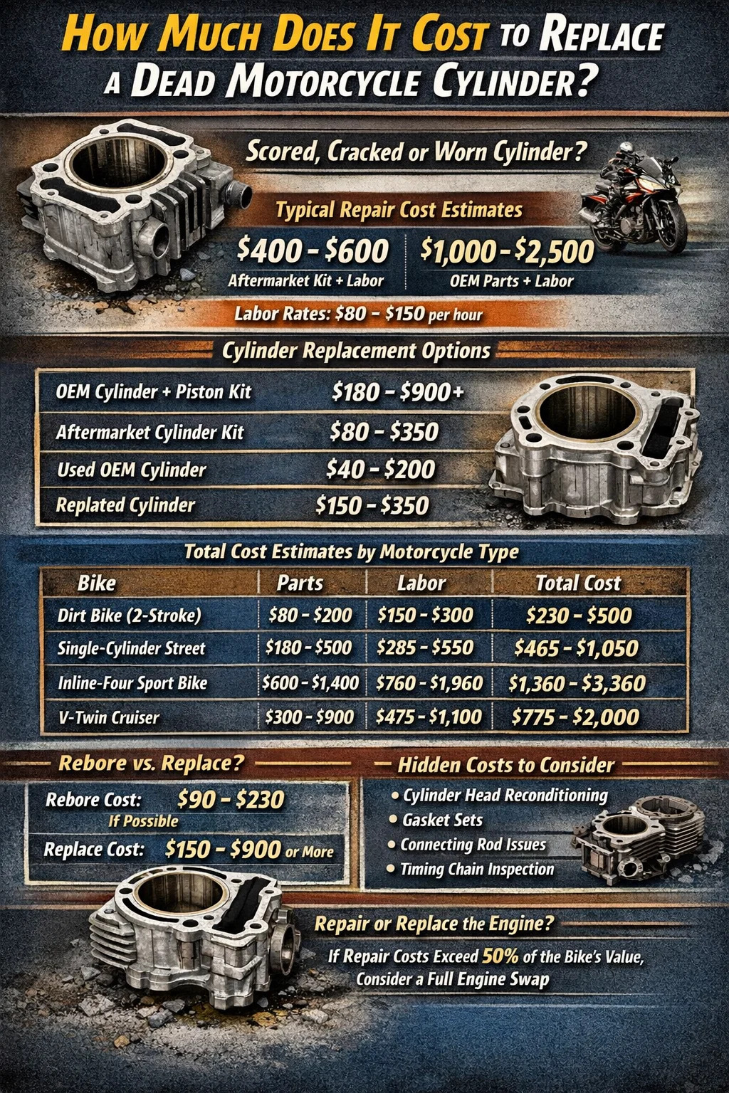 Ha a motorkerékpár hengere beszorult, megrepedt vagy a specifikációt meghaladóan elhasználódott, akkor egy javítási számlát néz, amely általában 300-1500 dollár vagy több , a motor típusától, a cserehenger vagy hengerkészlet költségétől és a bolti munkadíjtól függően. Egy kis egyhengeres ingázó kerékpáron egy pénztárcabarát utángyártott hengerkészlet 80-150 dollárba kerülhet önmagában az alkatrészekért. A nagy lökettérfogatú iker- vagy négyhengeres sportkerékpárokon az OEM hengeralkatrészek 600 és 900 dollár között mozoghatnak, mielőtt a szerelő felvenné a kulcsot. Adjon hozzá munkaerőt – amely általában óránként 80-150 dollárba kerül – és egy négy-nyolc órát igénybe vevő munkát, és az összköltség gyorsan emelkedik.