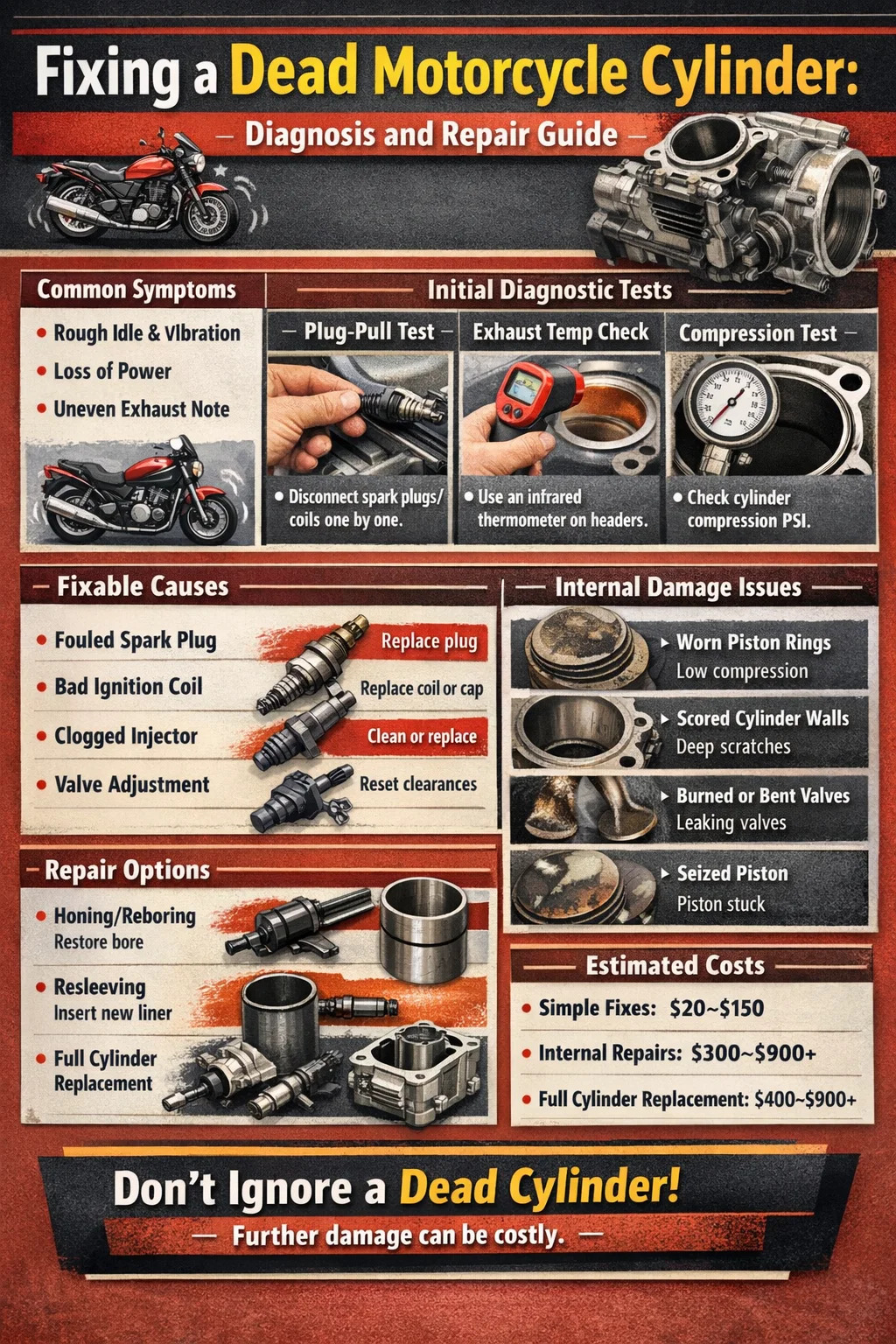 Egy elszennyeződött gyújtógyertya, eltömődött üzemanyag-befecskendező szelep, meghibásodott gyújtótekercs vagy kisebb szelepbeállítási probléma miatt kimerült motorkerékpár-henger viszonylag egyszerű és olcsó javítással életre kelthető. A spektrum másik végén a hornyolt furat, megrepedt henger, beszorult dugattyú vagy súlyos gyűrűkopás miatt nagyobb mechanikai munkára van szükség – beleértve az esetleges hengercserét vagy átfúrást. A lényeg az, hogy a "halott henger" nem egyetlen diagnózis. Ez egy olyan tünet, amely sok különböző kiváltó okra vezethető vissza, és mindegyiknek megvan a maga javítási útja és költsége.