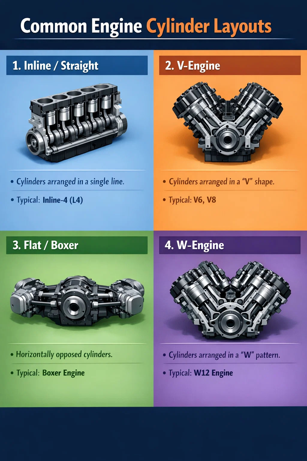 Alkalmazások: Általában közepes és nagy szedánokban vagy nagy teljesítményű sportautókban (mint például V6, V8) található. A motoros mezőnyben a V-twin klasszikusnak számít, egyedülálló ritmusáról és erős nyomatékáról ismert alacsony fordulatszámon.